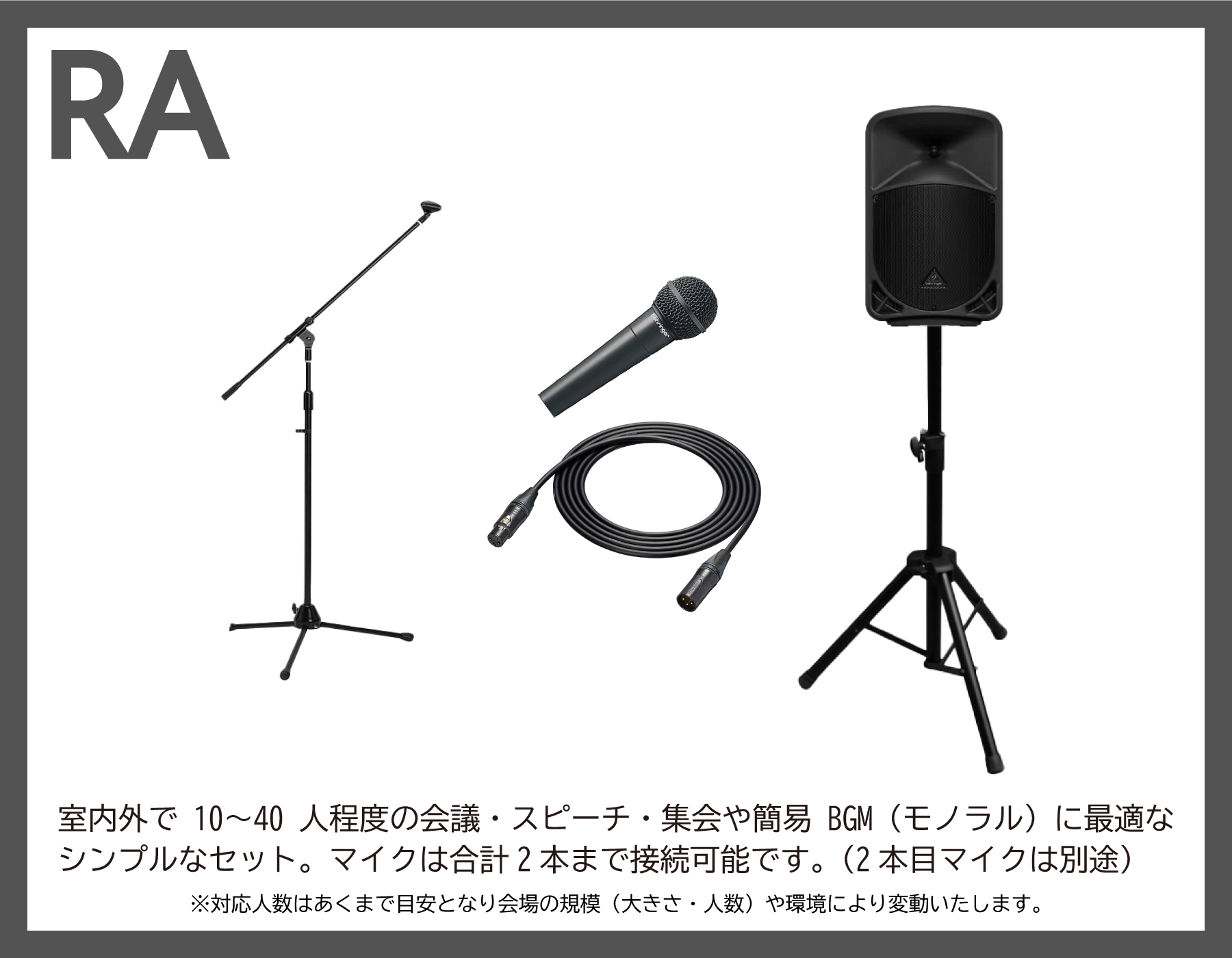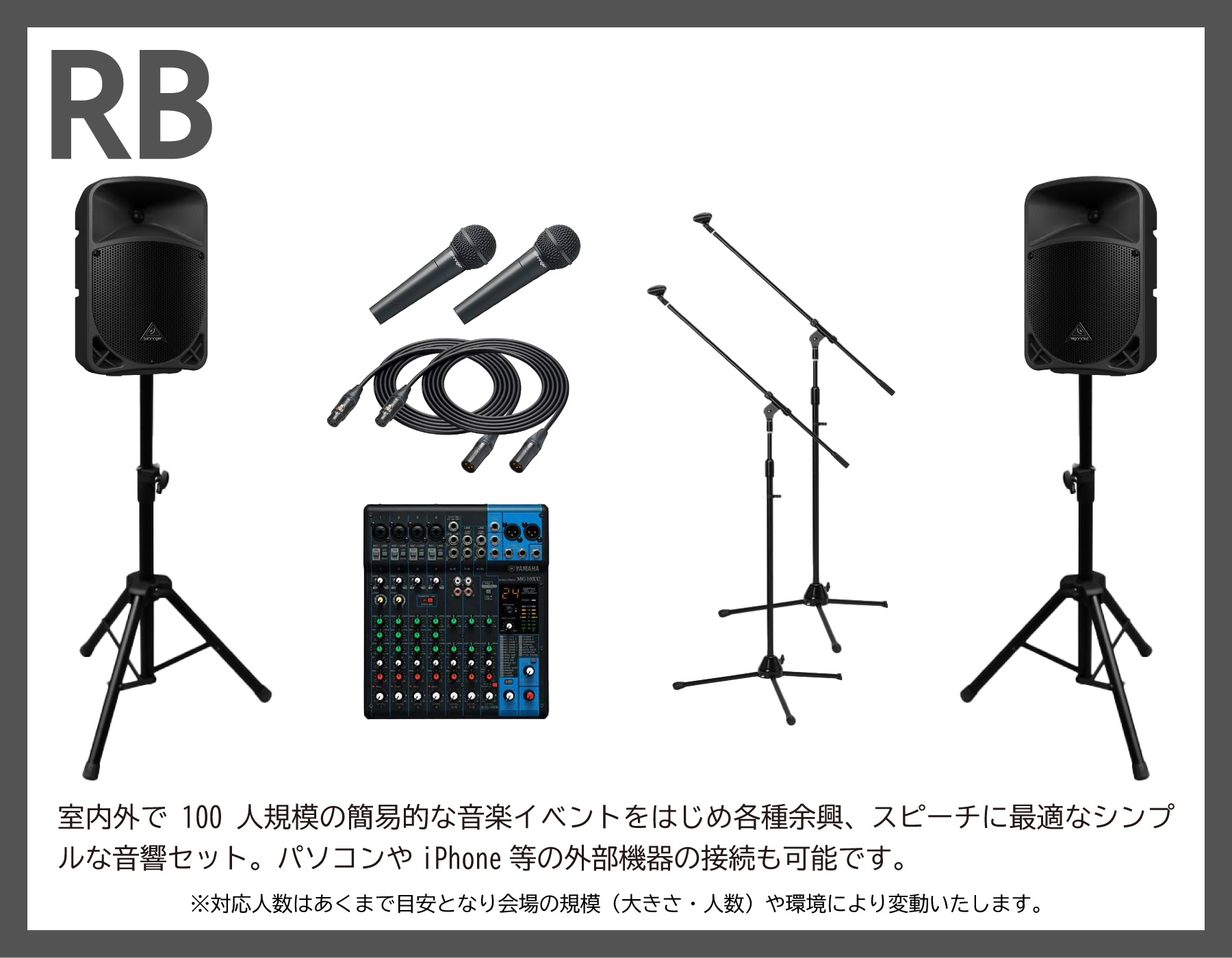 PA機材・DTM/DAW機器・レコーディング・譜面台・マイク/マイクスタンド・ラジカセ・各種ケーブル類など、音響機器を格安でレンタル致します。マイク1本からでもレンタル可能です。結婚式の二次会、祝賀会、運動会、文化祭、学園祭、ライブ、 製品発表会、コンベンション、プレゼンテーションなどの各種イベントでご活用下さい。