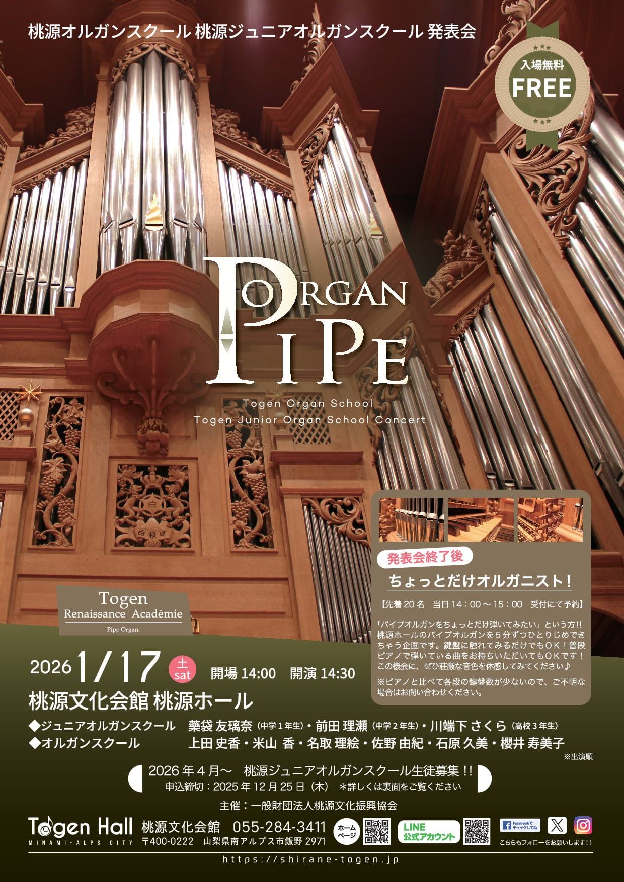 発表会終了後、先着20名を対象にパイプオルガンの鍵盤体験が実施されます。